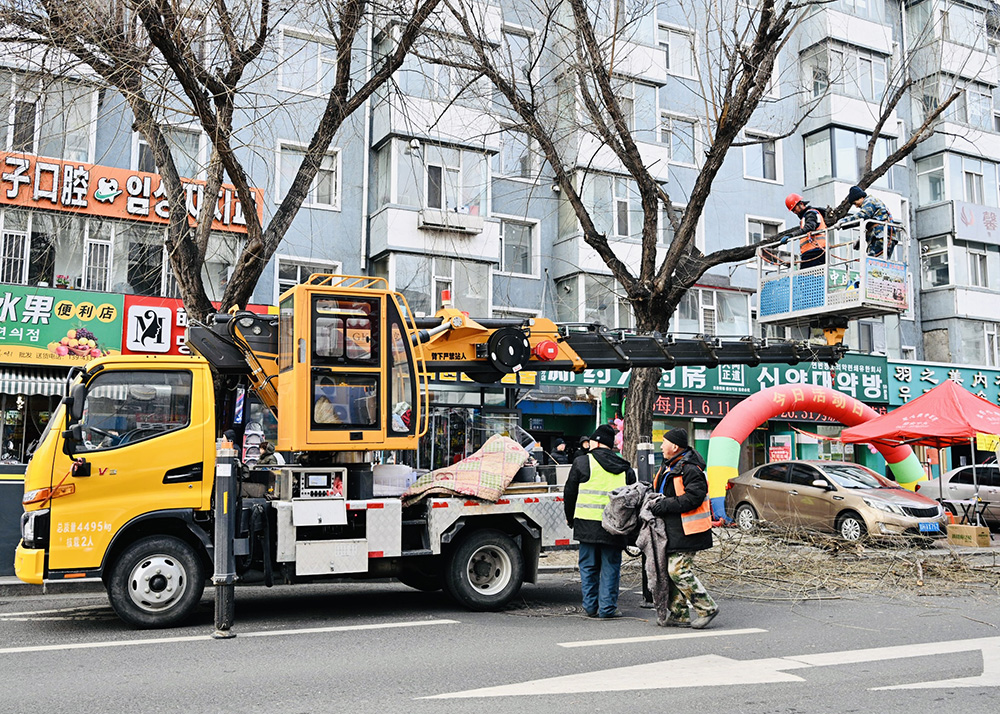 春暖催新绿,修剪正当时。随着气温回升,树木进入春季生长关键期。3月9日,延吉市林业局全面启动市区街路绿化带及行道树春季修剪工作,持续巩固城市绿化成效,优化市容景观。图为梨花路两侧,园林工作人员正精心修剪树木。