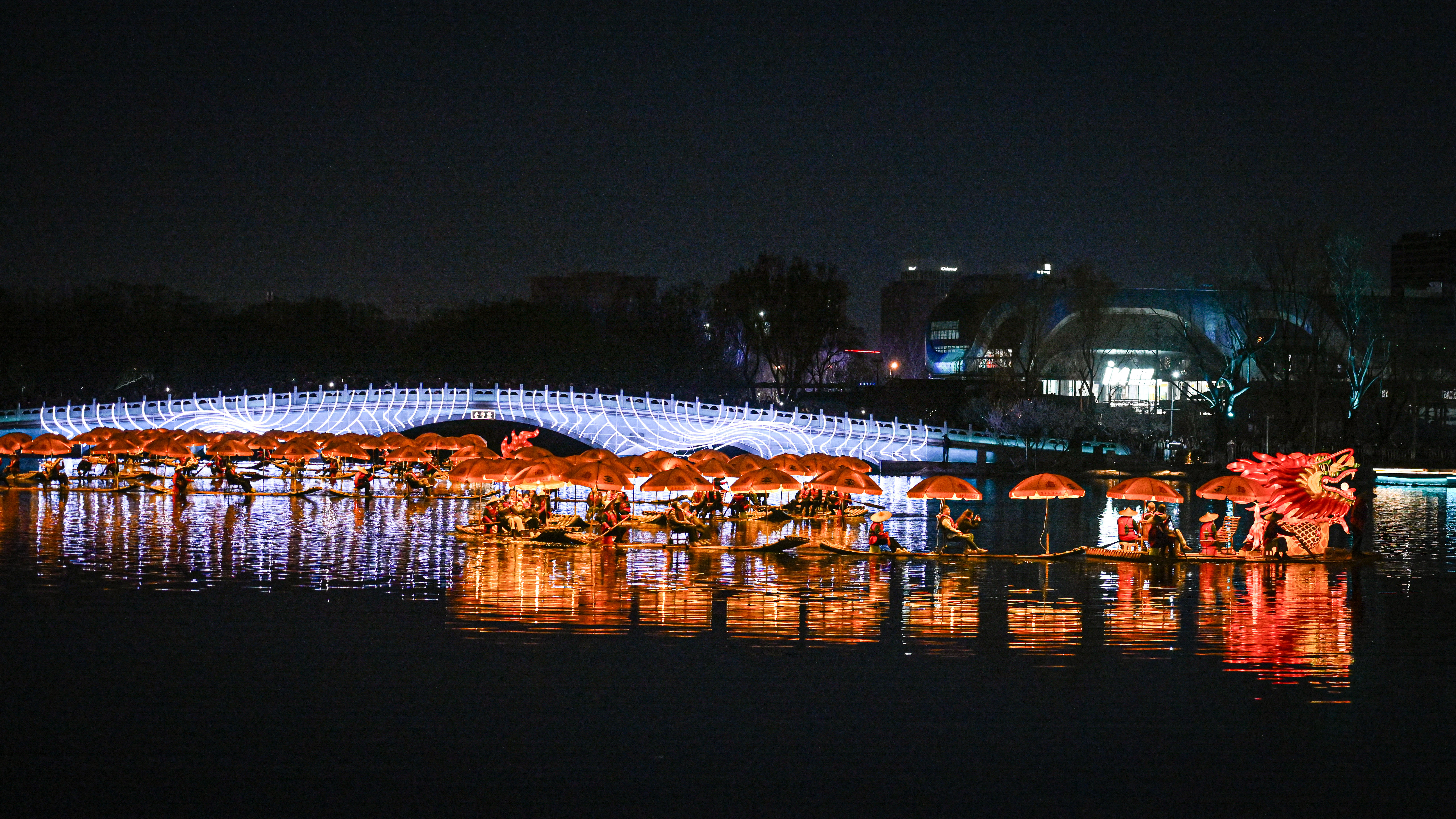 北京:“金龙”巡春亮马河 2026-03-23 来源: 新华社 3月22日,在北京市朝阳区亮马河水碓桥附近的水域上,来自广西阳朔的民俗项目“金龙巡游”精彩上演,众多竹筏首尾相连,宛若金色长龙,点亮春夜。新华社记者 陈钟昊 摄