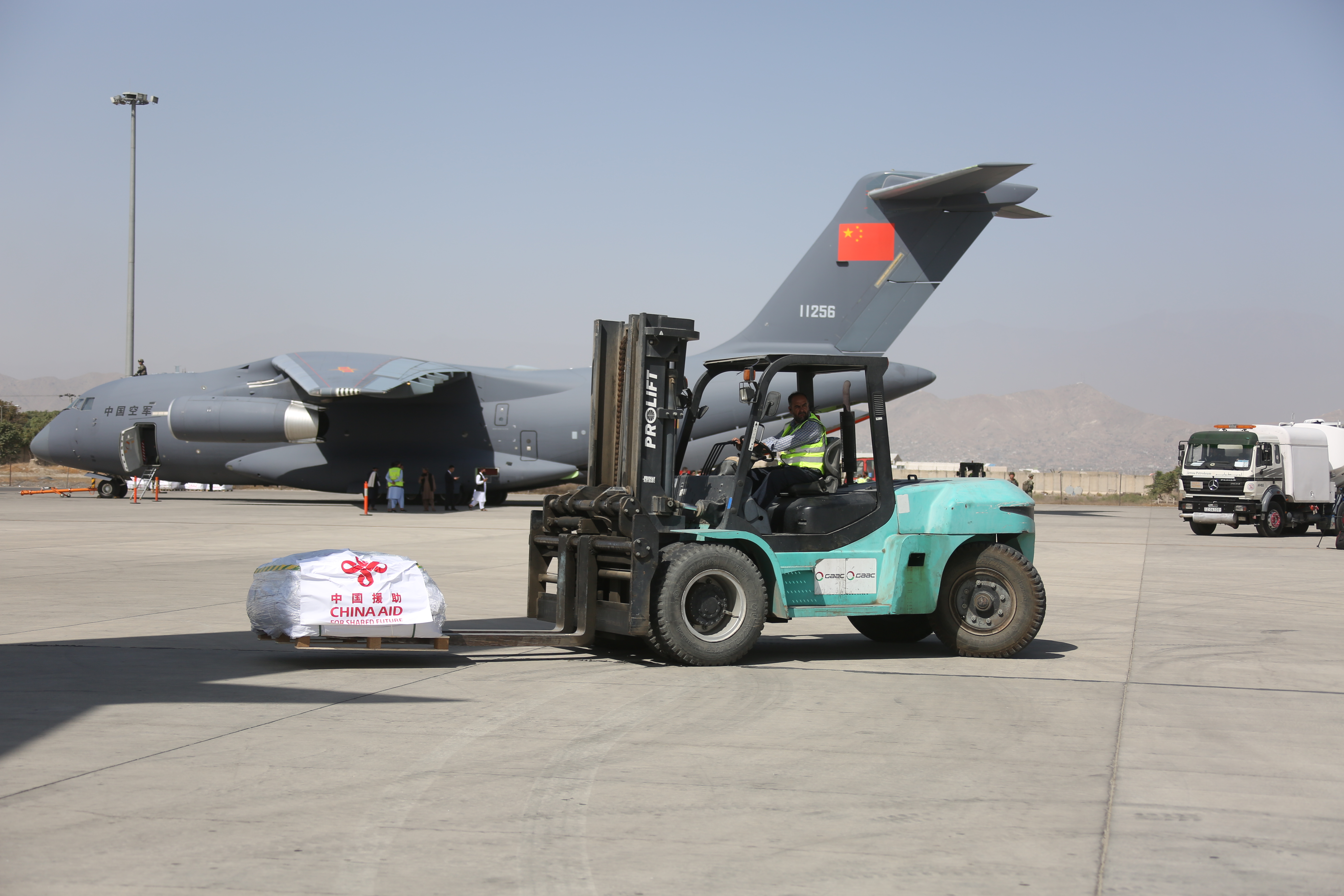 9月7日,在阿富汗喀布尔,工作人员运送从中国空军运-20飞机上卸载的援助阿富汗救灾物资。