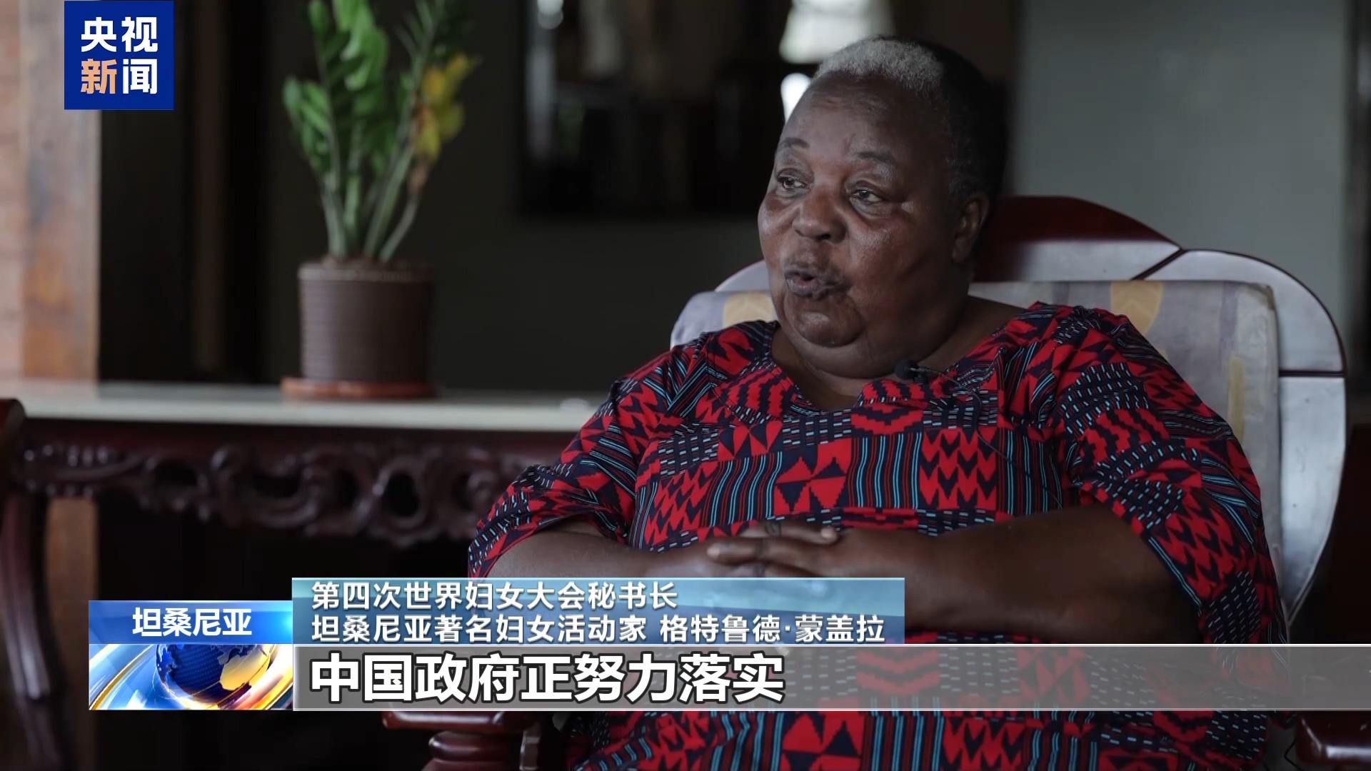 第四次世界妇女大会秘书长、坦桑尼亚著名妇女活动家 格特鲁德·蒙盖拉:这个称呼对我而言是一种莫大的荣幸,我不愿这份荣誉的意义褪色。我认为习主席尊重女性地位,注重保障女性权益,所以我很钦佩他。