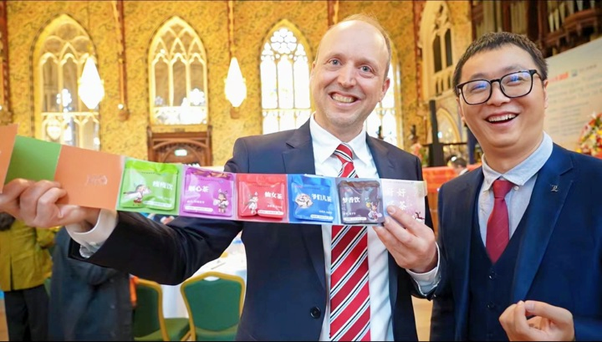 曼彻斯特大学教授John Haskell在现场饶有兴致地品尝由无锡市中医医院带来的各类中药茶饮,无锡市中医医院副主任中医师彭健耐心地解释着每一种茶饮的功效。在看到由新华日报社健康传媒中心与江苏省海滨康复医院联名打造的“好好喝茶”六连包养生茶时,John Haskell跟着彭健一字一句地读出“爷们儿茶”,引得在场观众笑出声来。