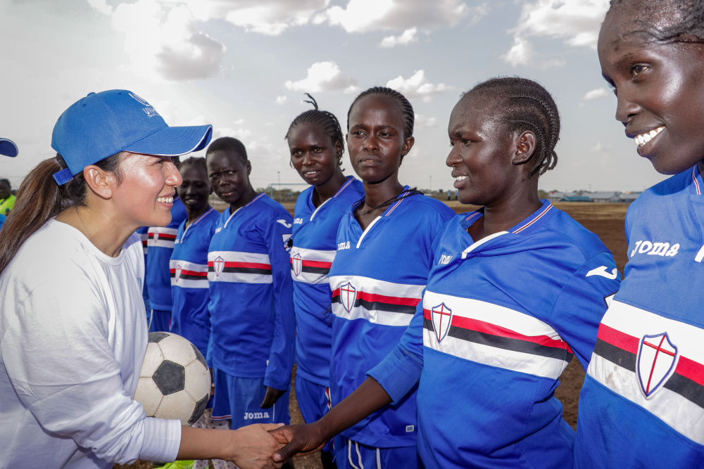 第二张照片里,在肯尼亚西北部卡库马难民营一片简易球场上,联合国难民署亲善大使杨扬正同当地一支女子足球队的队员握手、交流。来自南苏丹的玛格丽特就在其中。
