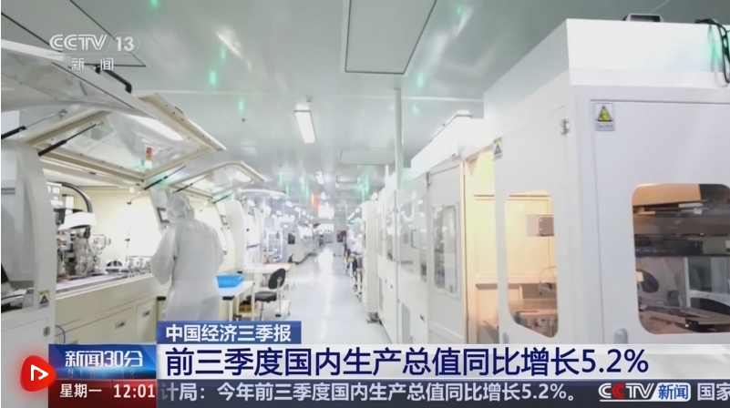 央视网消息:国家统计局10月20日发布最新数据,今年前三季度,我国国内生产总值同比增长5.2%。前三季度,国民经济顶住压力延续稳中有进发展态势,生产供给平稳增长,就业物价总体稳定,新动能稳步成长,经济运行展现出强大韧性和活力。