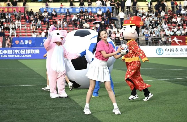 开场和中场时间,成为最动人的“民族团结课堂”。在安图主场,别开生面的“奇妙的惊喜”玩偶秀总会点燃全场:圆滚滚的“笨笨”模仿球员射门时趔趄的模样,让朝鲜族阿妈妮笑得前仰后合,代表8个县(市)的足球玩偶相互追逐、转圈互动,用最稚拙的方式传递“不分你我、团结一心”的情谊。这样的文化相融在每轮比赛的各个赛场轮番上演:敦化市文化馆以《向梦想出发》《超越梦想》歌曲串烧点燃热情;龙井市“龙鼓舞”用传统鼓点演绎足球激情;和龙市以“主客共享”模式打破地域界限,与客场作战的兄弟县(市)“合唱”“共舞”……精彩的表演既展现着延边“多元一体”的文化底蕴,也呈现着“各美其美、美美与共”的精神共鸣。