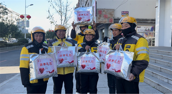 棉服、雨衣、紫砂杯……这40份价值5000元的御寒礼包,装着的不仅是御寒物资,更是这座城市对骑手们的关爱与敬意。接过礼包后,骑手赵欣宇脸上洋溢着开心的笑容:“有了党组织的关怀,我们心里特别暖。这个冬天,我们要做有温度、有爱心、有担当的外卖小哥!”