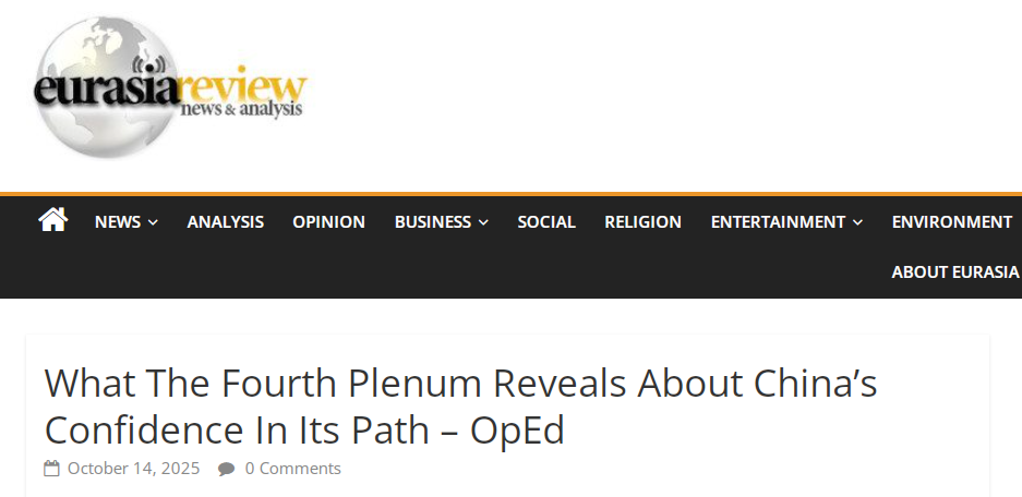 《欧亚评论》(Eurasia Review)网站题为《四中全会展示中国道路自信》的文章指出,中共二十届四中全会的召开释放出最鲜明信号,面对全球经济不确定性加剧的背景,中国依然展现出对自身发展道路的信心与战略定力。