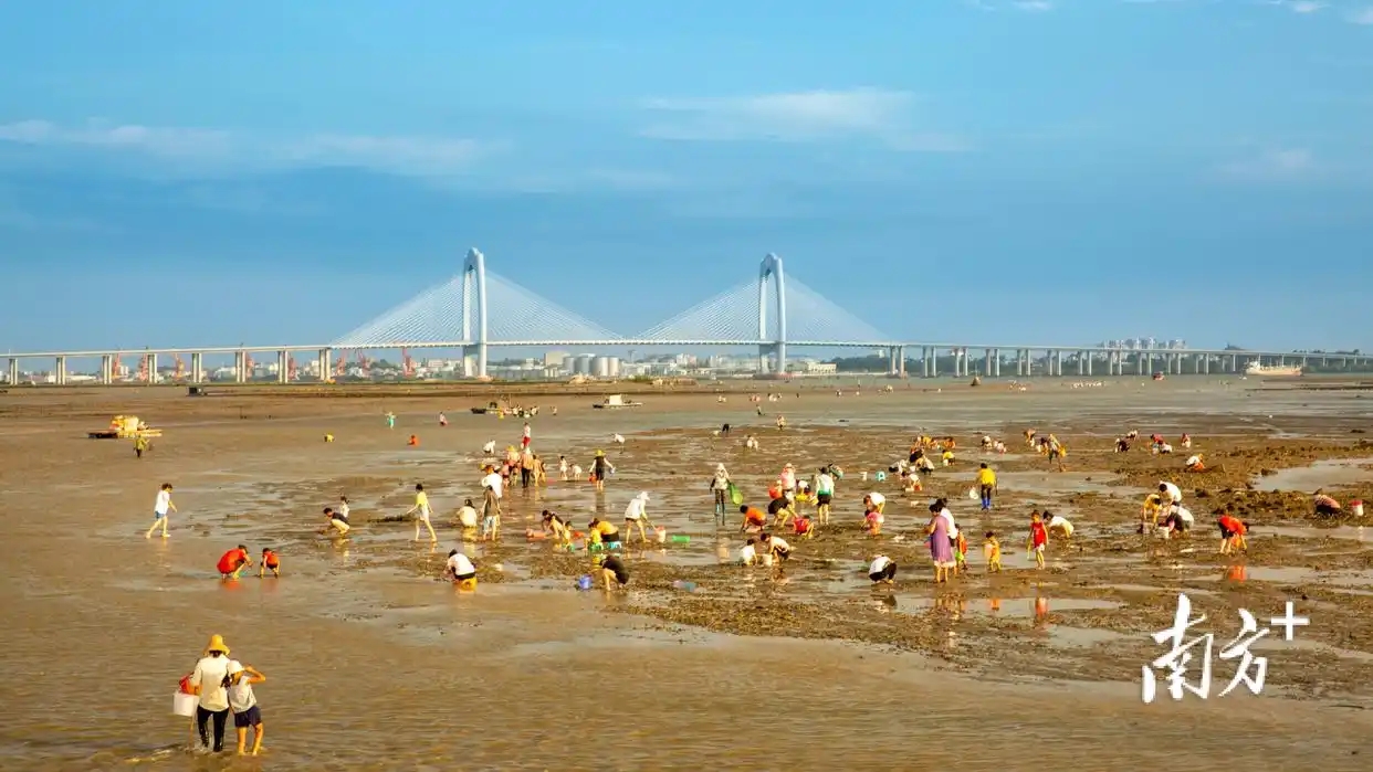 广东茂名陈村渔港退潮后,人们从四面八方赶过来,滩涂变得非常热闹。南方+记者 张鹏飞 摄