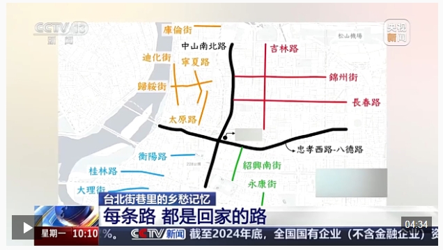 总台央视记者 李峥:我现在所在的位置是台北市中心。方圆一公里之内,我刚刚已经走过了南昌路。现在我所在的位置,就是金华街。台北市的路名很有规律性。东北片,基本就是大陆的东北地区的地名来命名,西南片则源自大陆的西南地区。