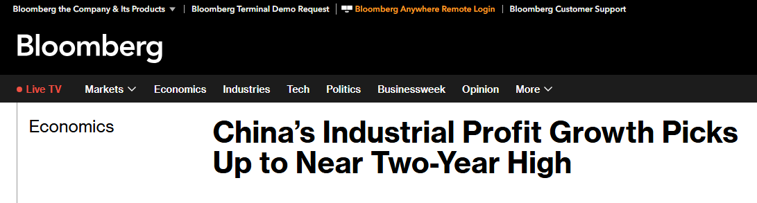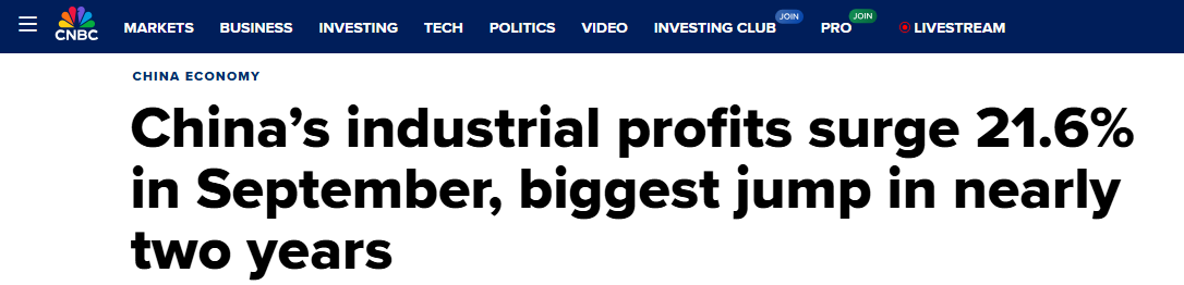 彭博新闻社的报道认为,中国9月份工业利润同比增长21.6%,是2023年11月以来的最大涨幅。这远高于彭博经济研究院的此前预测。