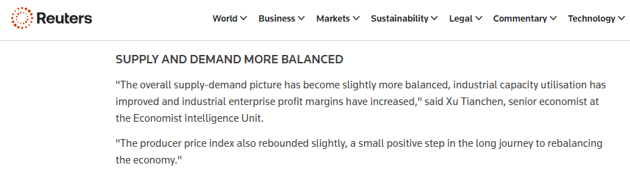 报道援引经济学人智库高级经济学家的观点说,当前中国供需格局已趋于相对平衡,工业产能利用率提升,企业利润率也有所改善。此外,工业品出厂价格指数也出现小幅回升,“这虽只是经济再平衡漫漫长路中的一小步,却也是积极信号”。