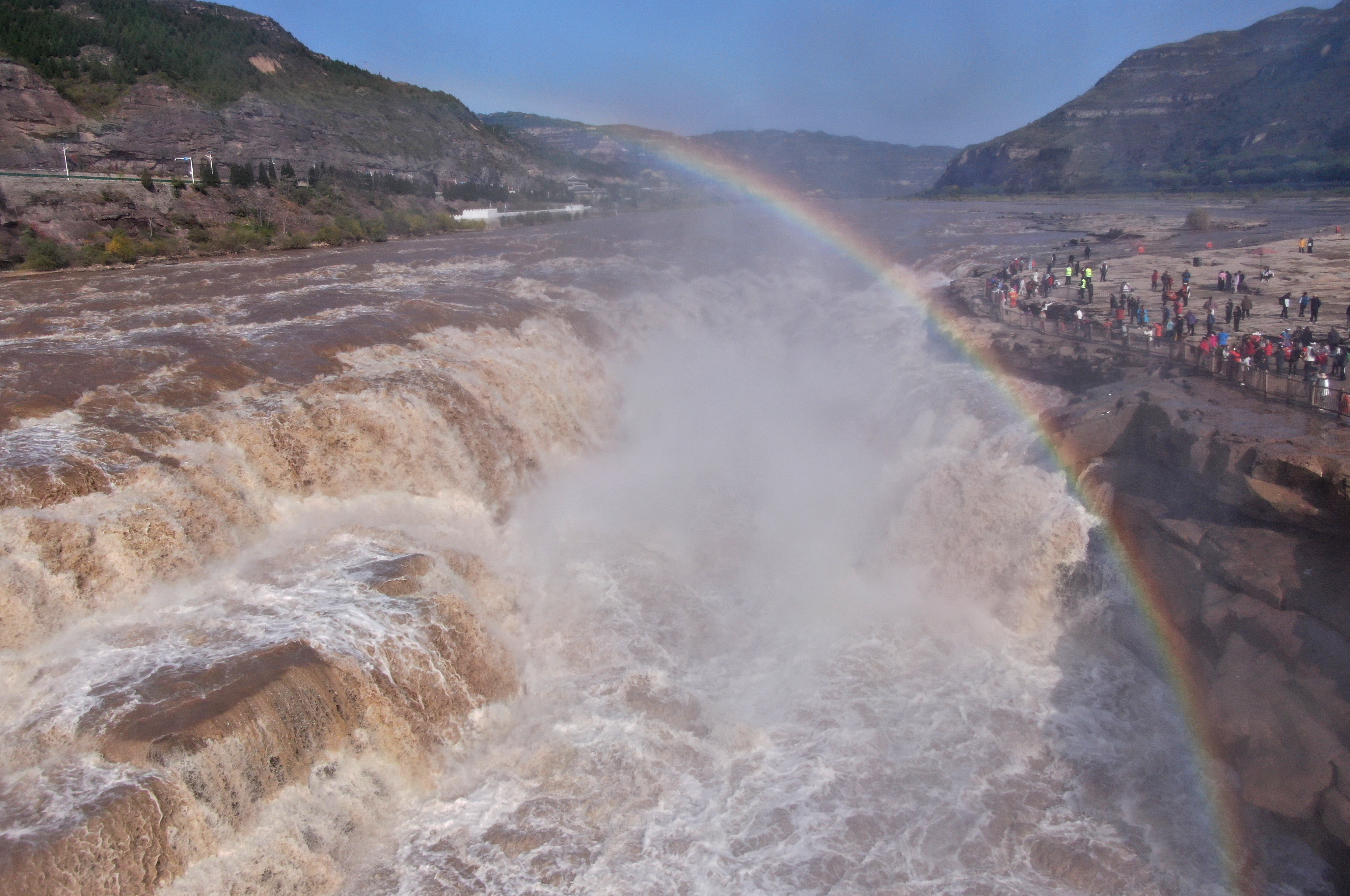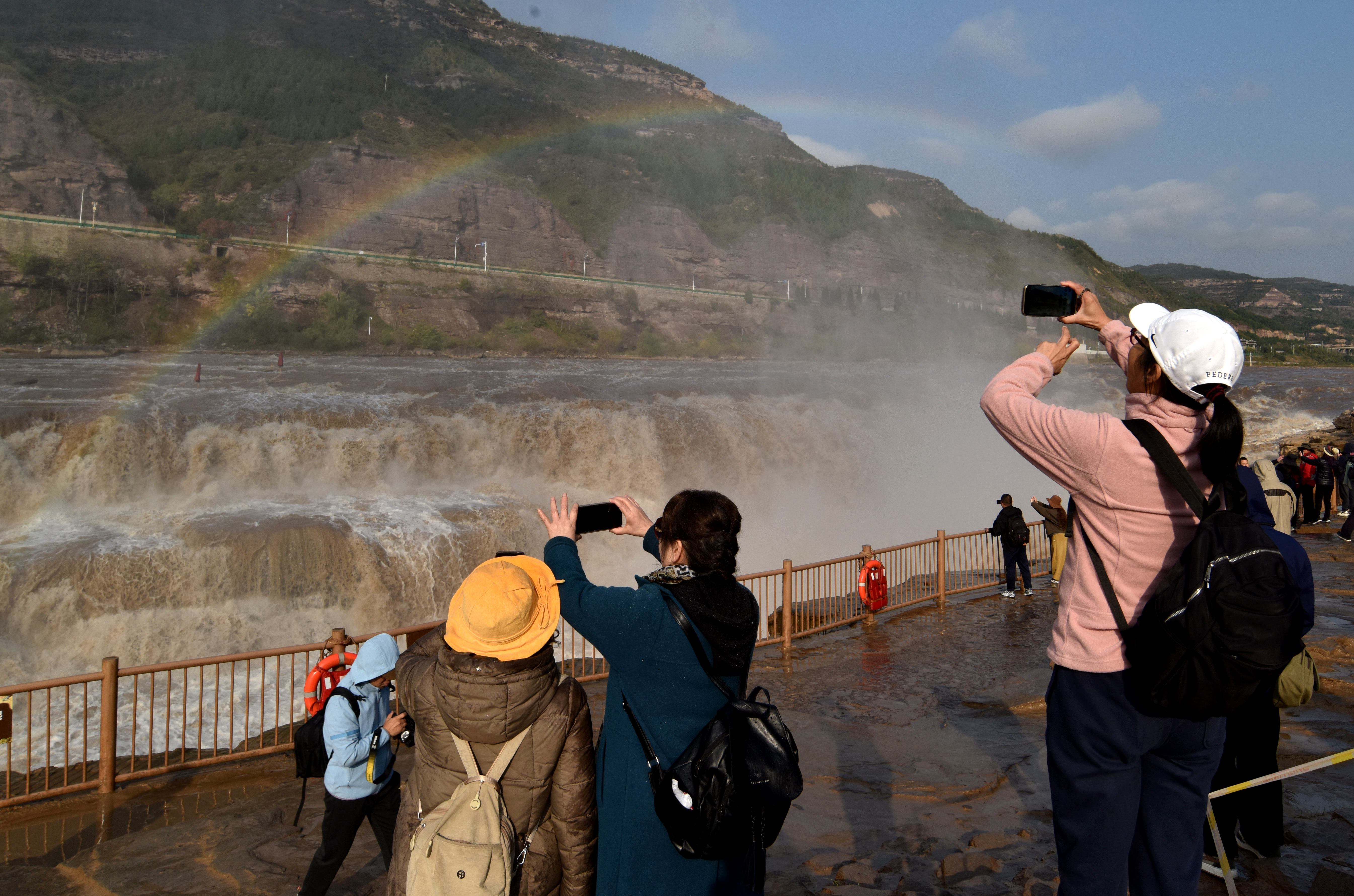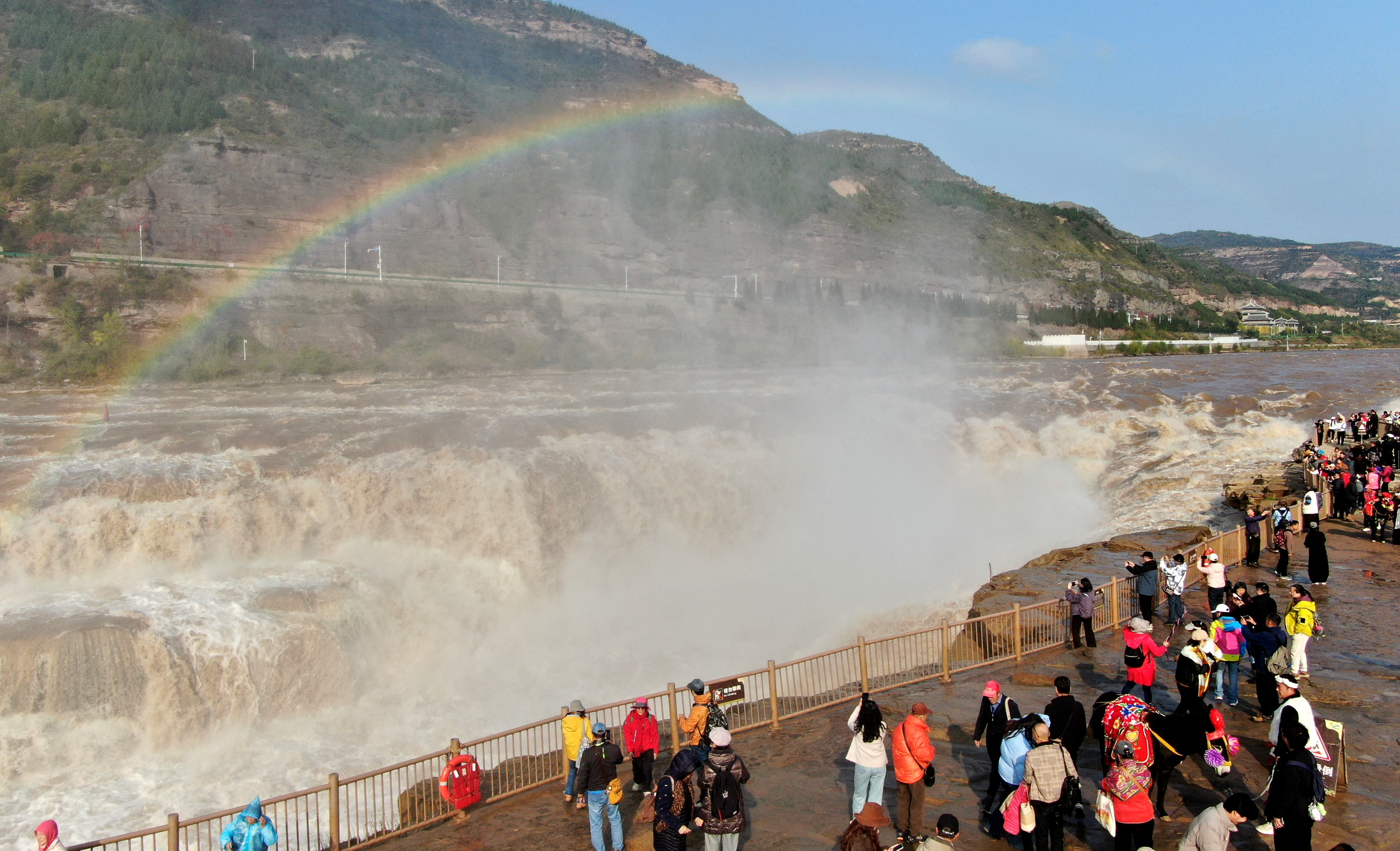 10月27日,位于山西吉县和陕西宜川县交界的黄河壶口瀑布景区天气晴好,飞溅的水雾在阳光照射下,形成一道壮美的“彩虹桥”。