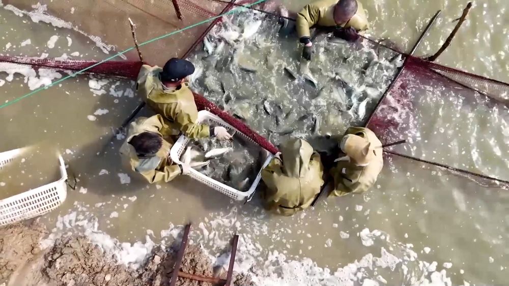 近日,在山东省郓城县张营街道现代农业科技示范园内,400多亩生态养殖水面迎来淡水鲈鱼集中收获期。昔日闲置的塌陷荒地,如今成为“致富塘”。