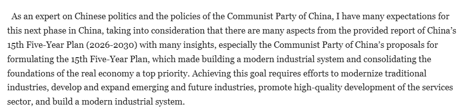 纳迪亚·希勒米在文章中称,作为一名中国问题专家,基于对中国“十五五”规划的深入研读,“我对中国未来发展充满期待”。文章指出,值得注意的是,在规划建议中将建设现代化产业体系、夯实实体经济根基列为优先任务。实现这一战略目标,需要着力推进传统产业现代化转型,培育壮大新兴与未来产业,推动服务业高质量发展,最终构建起先进的现代化产业体系。