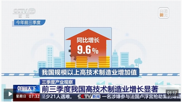 今年前三季度,我国规模以上高技术制造业增加值同比增长9.6%,快于工业平均水平3.4个百分点。规模以上高技术制造业对全部规上工业增长的贡献率为24.7%,工业经济“压舱石”作用凸显。