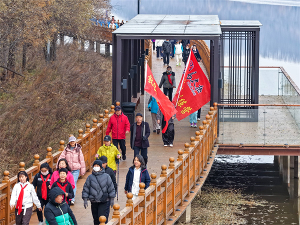 随着发令枪响,重阳登高活动正式开始。选手们精神抖擞,从六宝门出发,顺着蜿蜒的环湖路向山顶徒步前行。湖岸边秋景正盛,金黄的白桦叶、火红的枫叶与澄澈的湖水相映成趣。选手们或结伴而行、谈笑风生,或稳步攀登、享受运动,不时停下脚步用手机记录秋日美景,欢声笑语与清脆的鸟鸣交织在一起,成为六鼎山秋日里一道温暖的风景线。