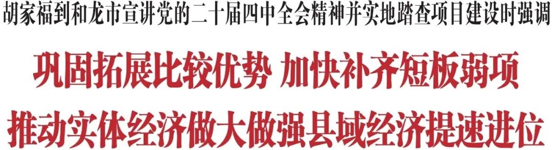 11月17日,省委常委、州委书记胡家福到和龙市宣讲党的二十届四中全会精神,并就项目建设进行实地踏查。他强调,要深入学习贯彻习近平总书记重要讲话和党的二十届四中全会精神,牢牢把握发展实体经济这个重要着力点,巩固拓展比较优势,加快补齐短板弱项,着力优化提升传统产业、培育壮大新兴产业,推动实体经济做大做强、县域经济提速进位。