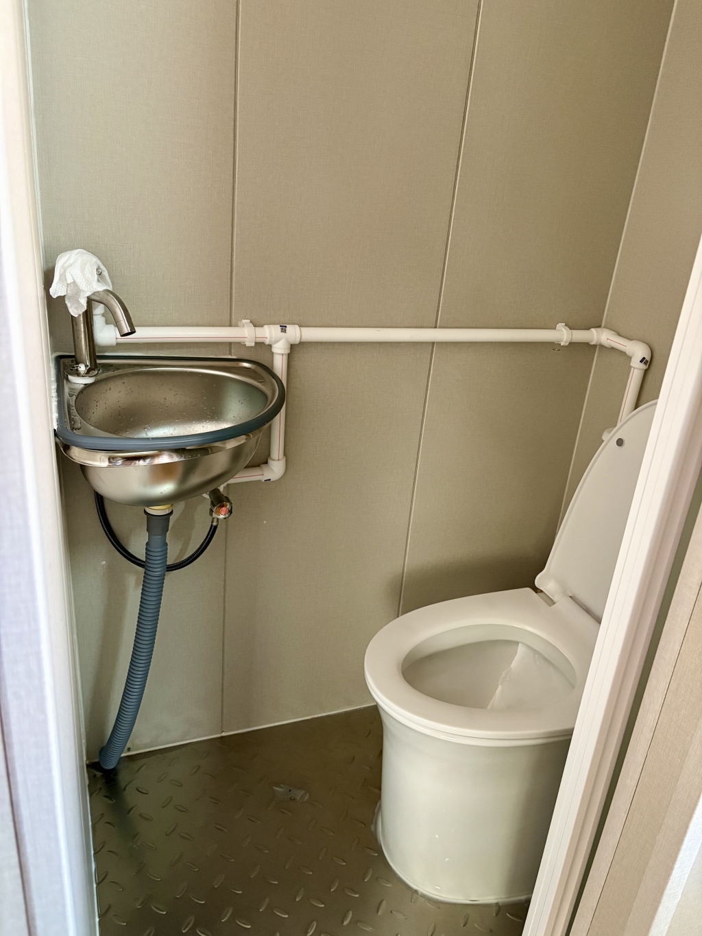 黄永安家,工作小组也上门四五次,最终他同意在屋角——原本挂空调、放电视机的地方——腾出位置设置卫生间。除了马桶,他还自购了一个小台盆,施工队一并安装,并调整了空调孔位。