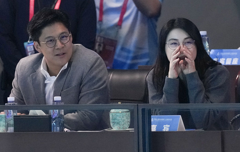 11月13日,郭晶晶(右)和霍启刚在场边观赛。新华社记者 薛宇舸 摄