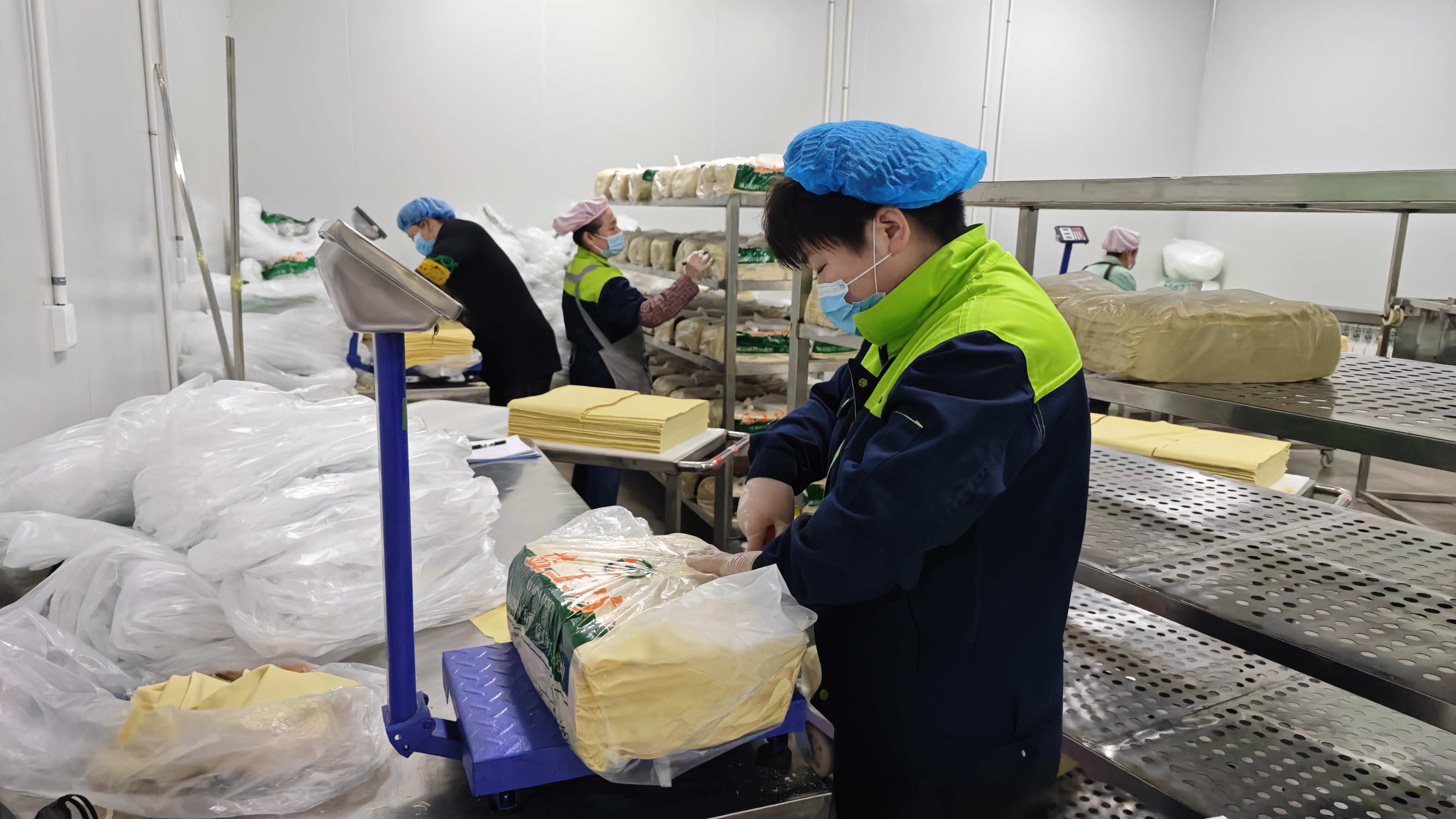11月21日,记者来到位于产业园10号楼的企业生产车间,目睹了干豆腐从黄豆到成品的完整流程。在泡豆磨浆车间,输送槽将泡发好的黄豆送入磨浆机,制成生豆浆;随后,在煮浆过滤车间,生豆浆被灌入不锈钢罐中蒸煮、过滤;在点制豆腐脑车间里,工人们有序地向过滤好的豆浆中注入卤水;在放线车间,如稀粥般的豆腐脑通过管道均匀铺设在行进中的豆腐布上,流速控制着干豆腐的最终厚度。机器左右摆动,将豆腐包叠成一摞,压榨成型。随后进入扒包环节,通过轮转装置将成型的豆腐与布分离,再经刀切形成一叠叠干豆腐,经包装,冷藏24小时后由专用冷链车发往各地。