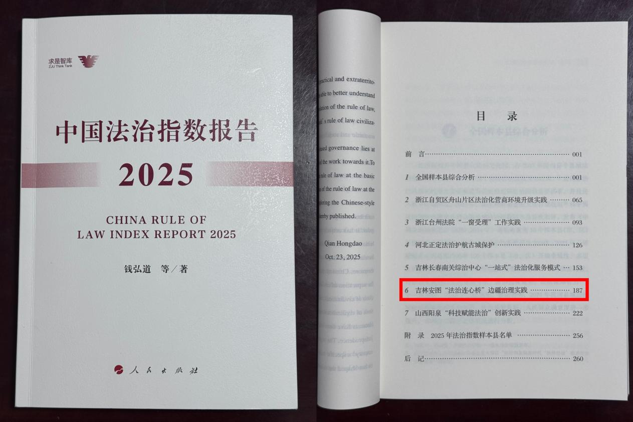 11月22日,在第四届新时代调解论坛暨第七届新时代“枫桥经验”论坛上,《吉林省安图县“法治连心桥”边疆治理实践》被收录于《中国法治指数报告2025》白皮书,并入选“2025法治指数十大典型样本”,向全国展示了边疆治理的“安图样本”。