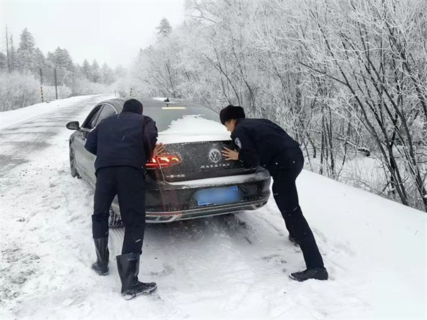 考虑到夜间风雪持续加剧,林区道路能见度较差,路面结冰情况进一步恶化,为有效规避二次风险,民警将两名游客妥善安置在旅店休息。次日清晨,风雪渐停,为确保游客出行安全,民警协助游客将车辆推至主干路的防滑区域,随后驾驶警车开启“领航模式”,直至将车辆安全护送出冰雪危险路段,民警才放心返回工作岗位。