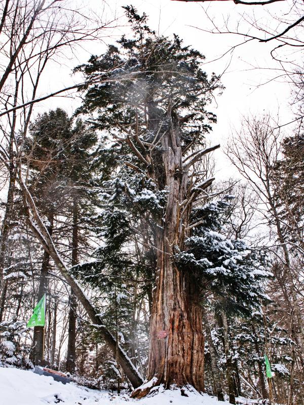 行至汪清林区荒沟林场63林班,沿着山路拾级而上,风吹在脸上犹如刀割,顺着大衣领口直冲身体,民警们深一脚浅一脚地前行,积雪顺着鞋口灌进鞋内,一股凉气瞬间从脚掌传遍全身。事实上,民警们习惯了这样恶劣的天气,滑倒,就爬起来,手冻麻了,摘下手套呼一口热气暖一暖……半小时后,一棵3000多年的红豆杉展现在我们面前,20余米的身躯直冲云霄,1.68米的胸径环抱年轮,历经千年岁月依然屹立挺拔,这棵红豆杉需五个成年人才能环抱过来。即便在冬日,枝叶仍倔强地保持着翠绿,与洁白的雪相互映衬,构成了一幅绝美的画卷。