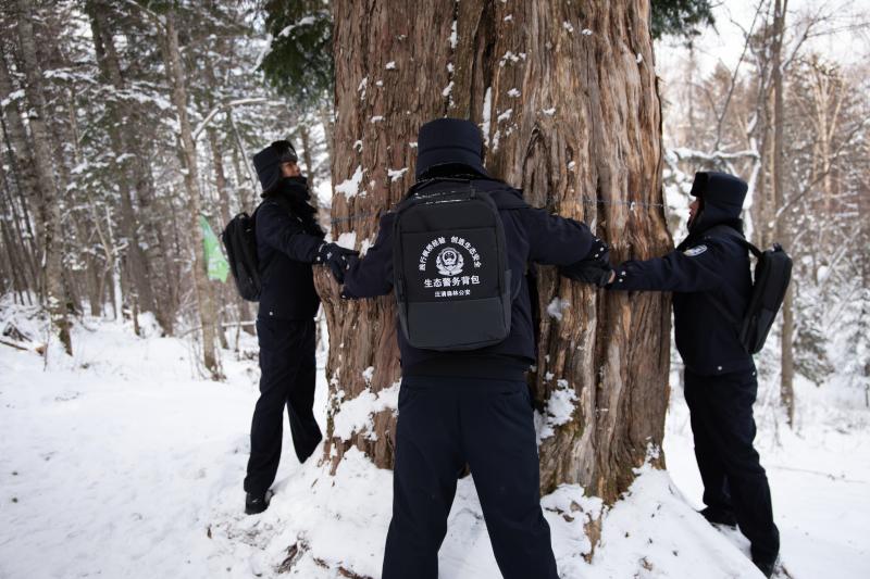 12月初的一场降雪,覆盖了汪清广袤的林区。水墨山林,一抹藏蓝穿梭其间,那是省公安厅森林公安局汪清森林公安分局金苍森林派出所的民警们正在巡山。此行的目的是巡护一棵3000多年的红豆杉是否被雪压断树枝和遭到人为破坏及生长情况,再悬挂保护古树保护条幅和标语。
