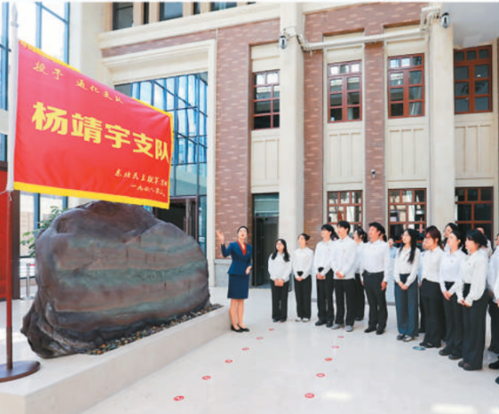 长春理工大学马克思主义学院的同学们在展厅里聆听“杨靖宇支队”战旗背后的故事。李姣月摄