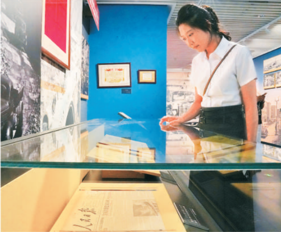 一名观众在展区内阅读《人民日报》关于解放牌卡车试制成功的报道。李 洋摄