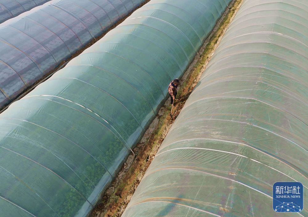 ↑ 12月10日,河南省南阳市新野县城郊乡吕庄村,村民在蔬菜种植基地对蔬菜大棚进行封土加固(无人机照片)。新华社发(高嵩摄)