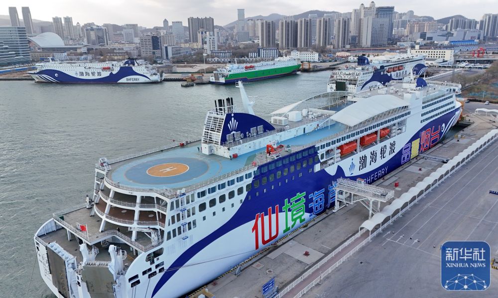 ↑ 12月11日,客轮在山东港口烟台港停靠避风(无人机照片)。新华社发(唐克摄)