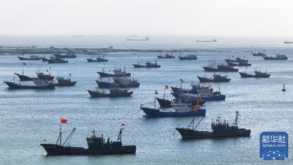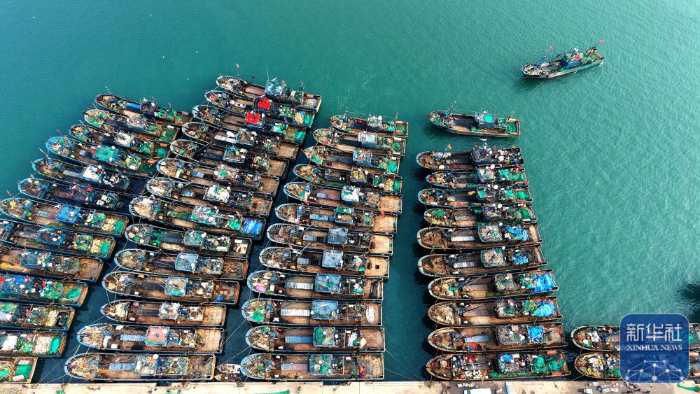 ↑ 12月11日,在山东青岛西海岸新区积米崖渔港,渔船停靠在泊位上(无人机照片)。新华社发(俞方平 摄)