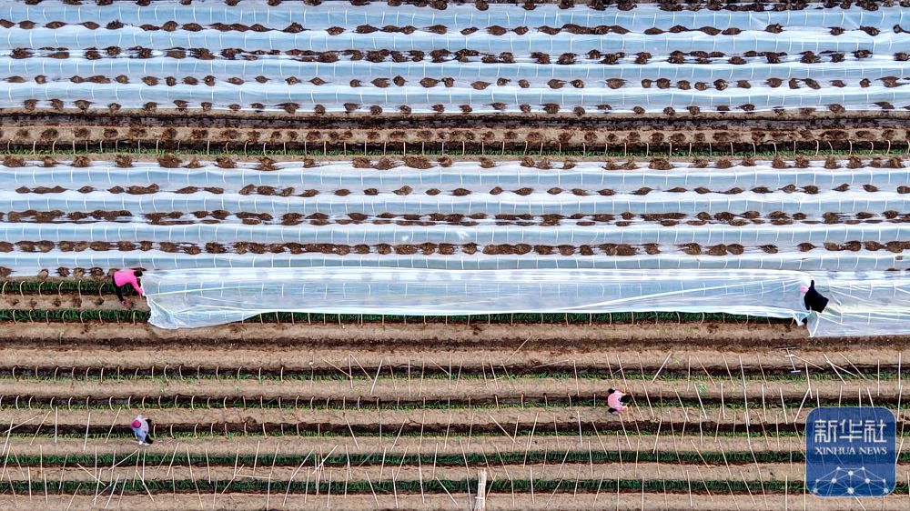 ↑ 12月11日,在山东省临沂市平邑县地方镇,村民为种植的蔬菜幼苗覆盖保温薄膜(无人机照片)。新华社发(武纪全摄)