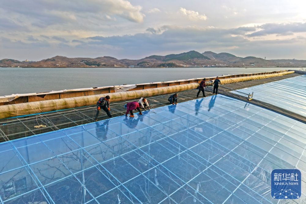 ↑ 12月11日,在山东省烟台市福山区张格庄镇,农民为樱桃大棚更换新的塑料薄膜(无人机照片)。新华社发(孙文潭摄)