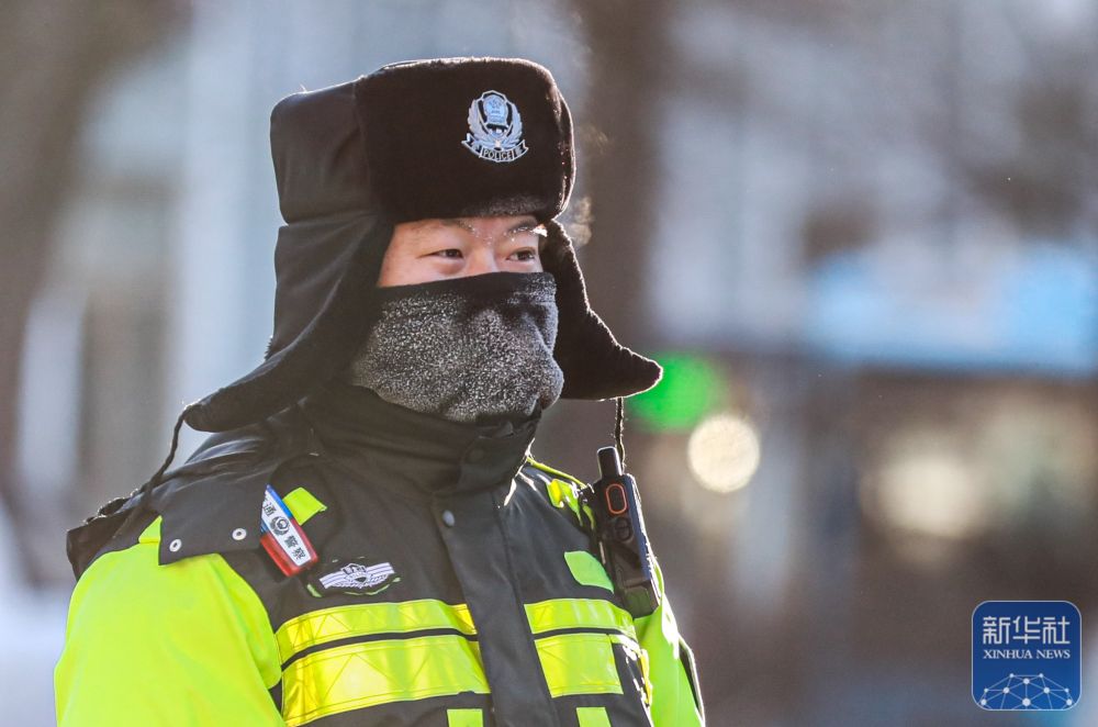 ↑ 12月11日,在黑龙江省伊春市伊美区,一名交警在寒潮中指挥交通。新华社发(李佳星摄)