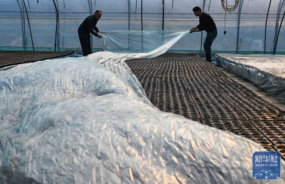 ↑ 12月11日,在河南省商丘市夏邑县会亭镇朱瓦房村大棚育苗基地,村民为刚刚下种的育苗苗床覆盖薄膜保温。新华社发(王高超摄)
