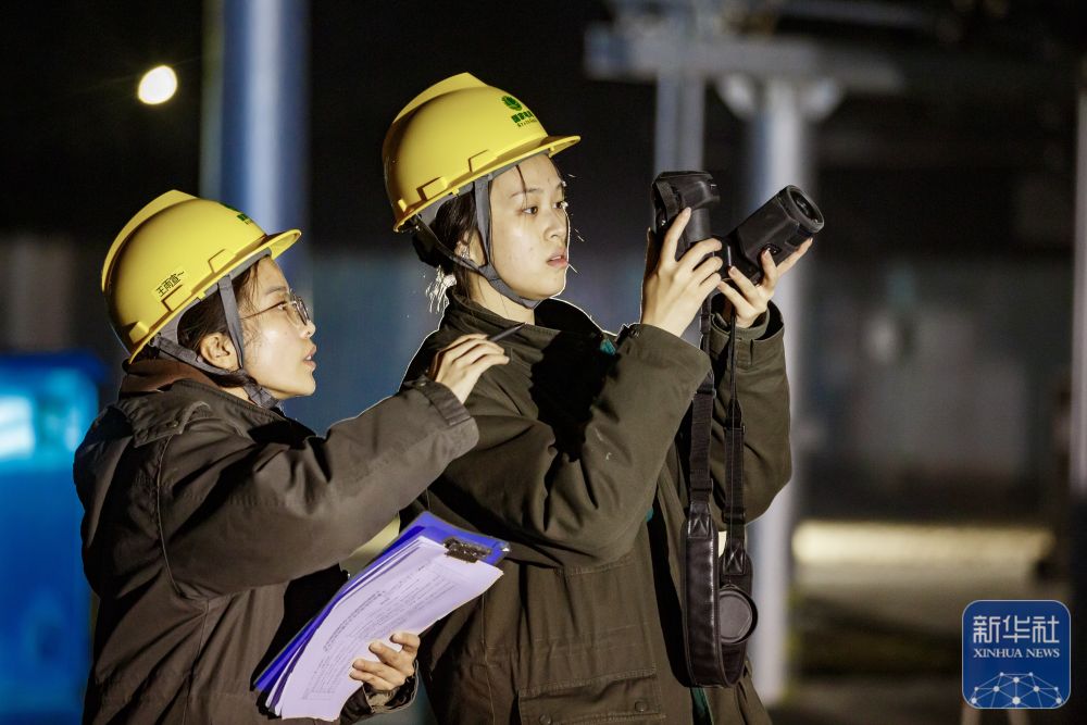 ↑ 12月10日,在河南省商丘市睢县110千伏董店变电站内,国网河南省电力公司睢县供电公司工作人员在对设备开展夜巡。新华社发(徐泽源摄)
