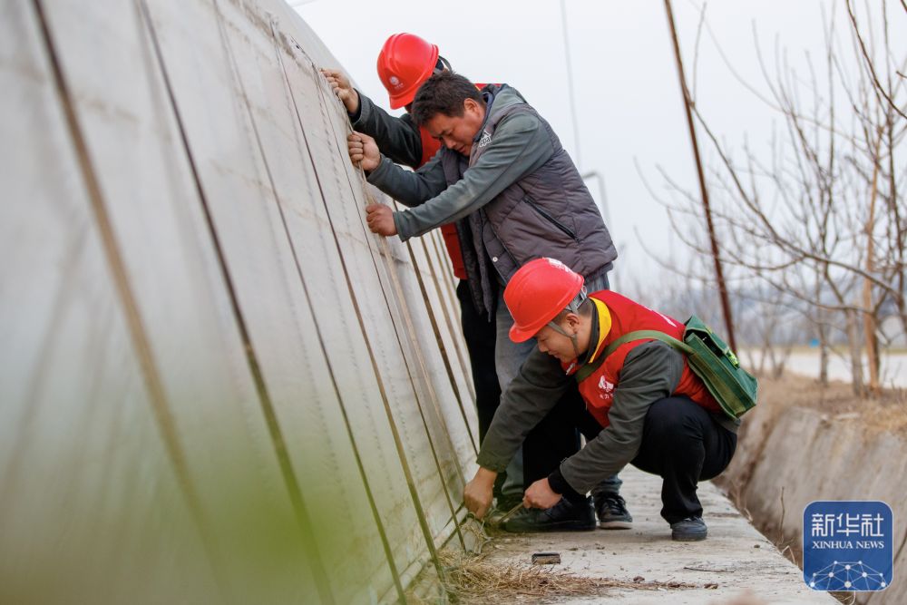 ↑ 12月10日,在河南省商丘市睢县周堂镇齐庄村有机蔬菜种植基地内,国网河南省电力公司睢县供电公司“电力雷锋”志愿服务队志愿者帮助菜农加固蔬菜大棚。新华社发(徐泽源摄)