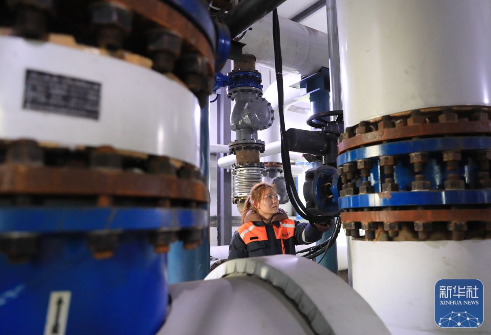 ↑ 12月10日,热力公司员工在河南省焦作市温县城区集中供暖首站对供热设备进行检查。新华社发(黄福兴摄)