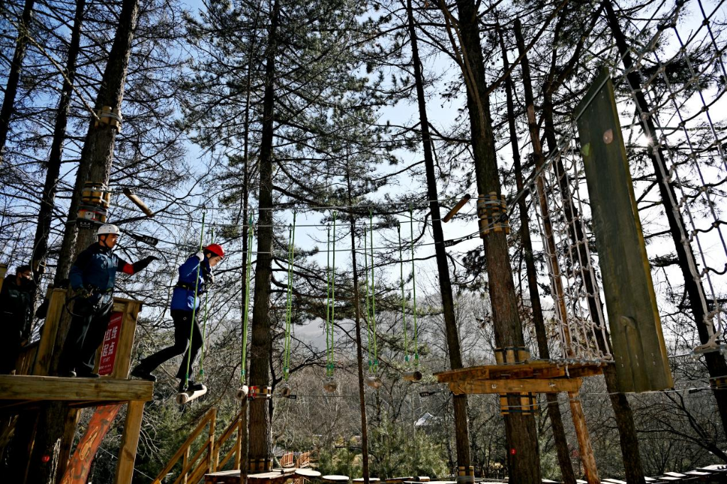 游客在大东沟森林旅游度假区体验丛林穿越。新华网 发