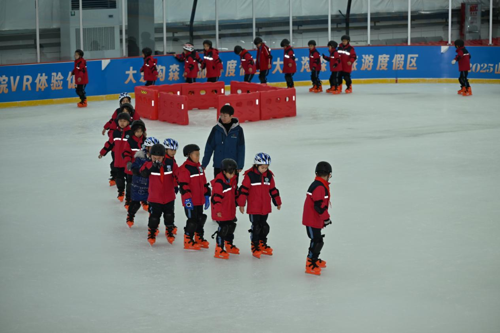 在王营庄文旅科创小镇气膜滑冰馆,离石区一所小学的孩子们在体验滑冰。新华网 发