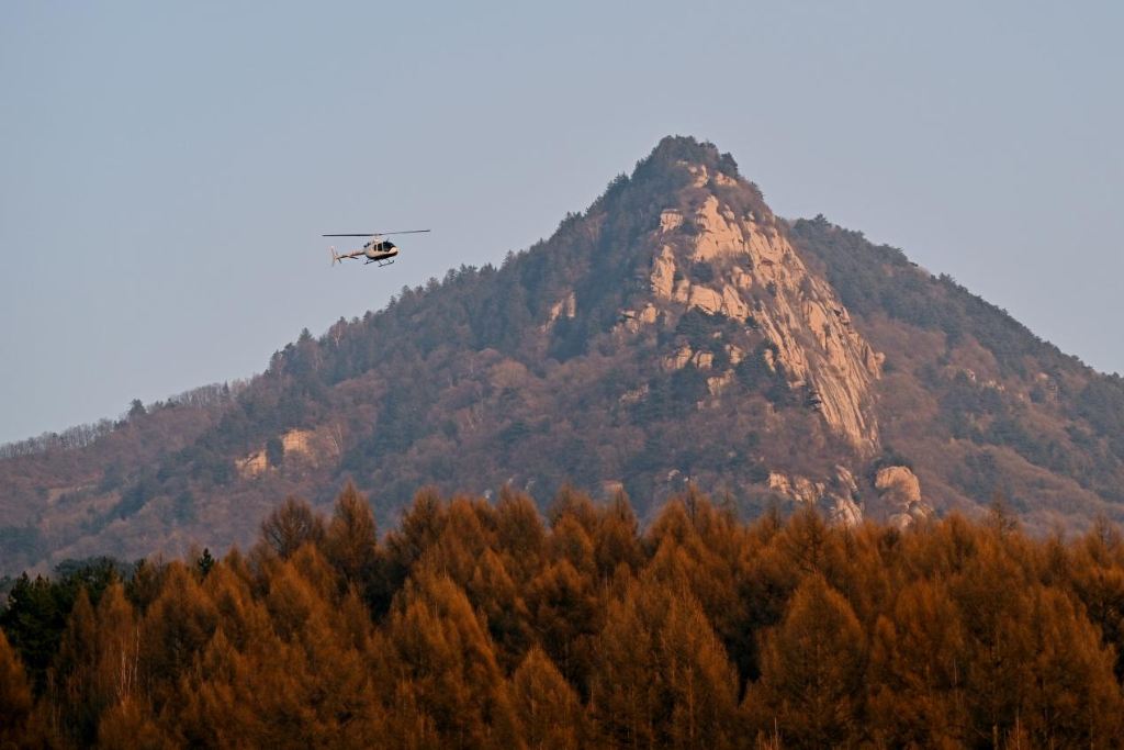 在大东沟森林旅游度假区,游客搭乘直升机欣赏美景。新华网 发