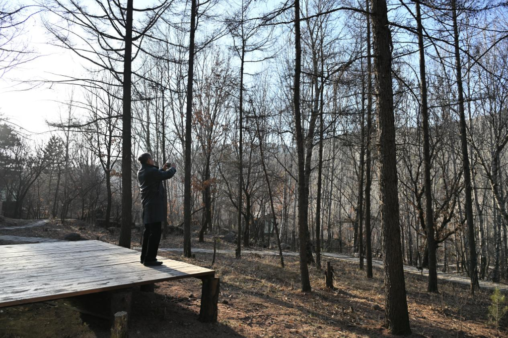 在离石大东沟森林旅游度假区,张红宇用手机记录美景。新华网 发