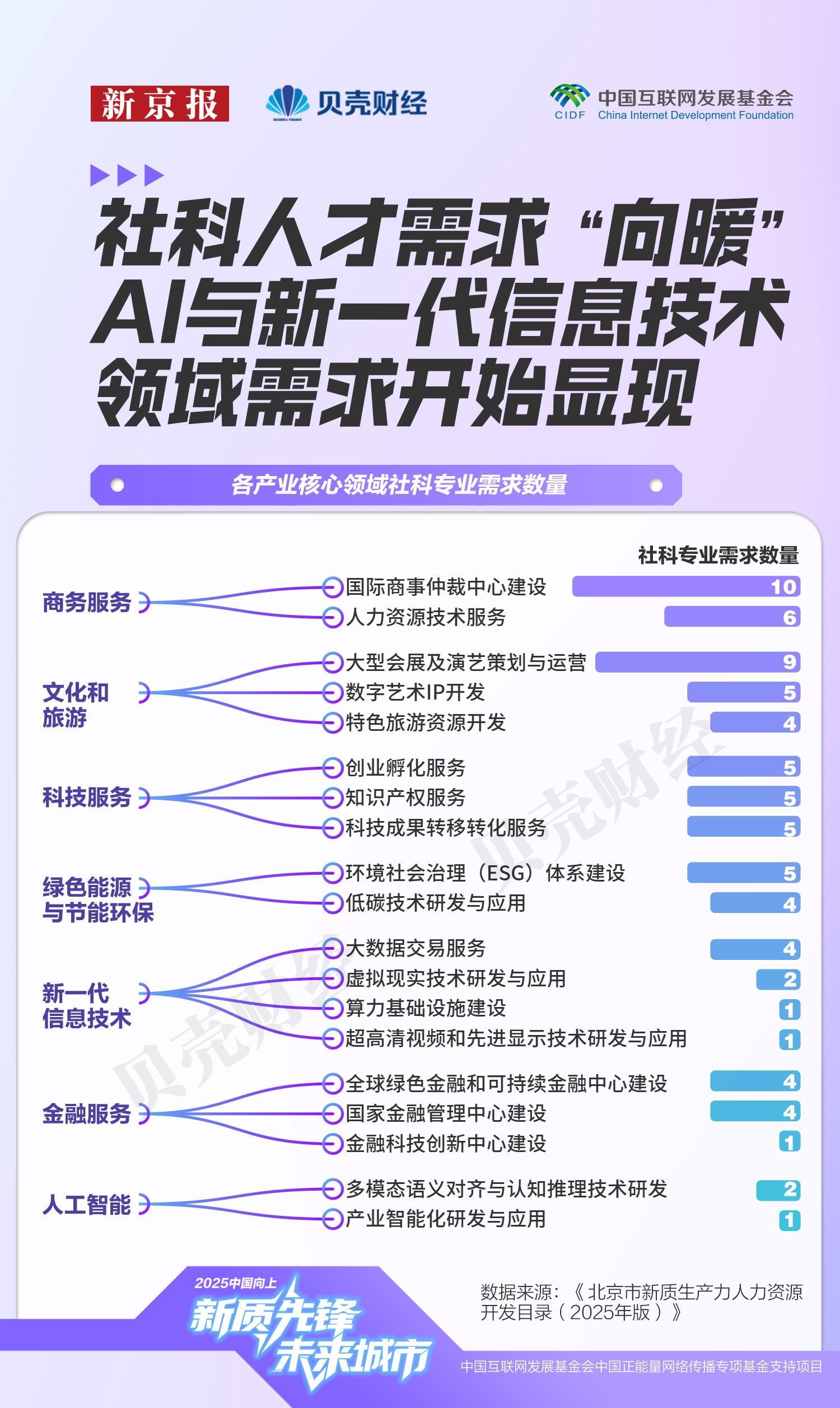 新质生产力带来的复合型人才需求,为社科专业创造了新的市场空间。《目录》显示,社科类人才虽主要集中在商务服务、文化旅游和科技服务等服务业领域,但需求已延伸至人工智能、新一代信息技术等核心科技产业。