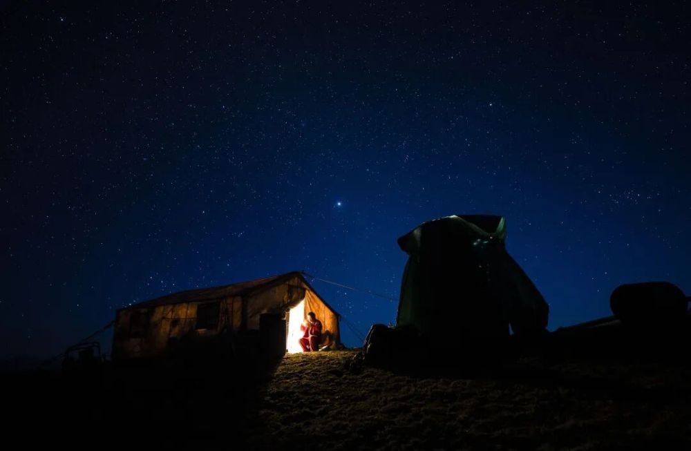 这是今年五一前夕,我和新疆日报记者蔡老师到物探队采访拍下的一张照片。在海拔3000多米的昆仑山巅,夜幕降临,辛苦了一天的钻井机组钻工们回到山顶临时宿营地,孤零零的小帐篷透出温暖的灯光,一名钻工坐在帐篷口吃晚饭,头顶是西昆仑的漫天星河,他们是找油找气的石油人,他们的工作既浪漫又艰辛。@王健 美好的瞬间,不一定要多么惊天动地,早餐的一杯热豆浆、朋友的拥抱、抬头就能看到的晚霞,都足以温暖每个普通人的心。