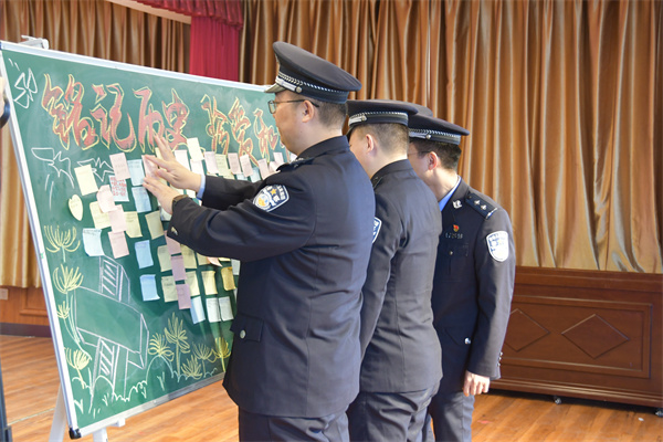 三合边检站民警窦常龙向师生们阐述了国家公祭日的历史背景与深远意义,激励学生们铭记历史、肩负使命,为民族复兴而努力学习。民警与师生共同在彩色卡片上写下对祖国与和平的诚挚祝福和期盼,并张贴于“祝福墙”上。