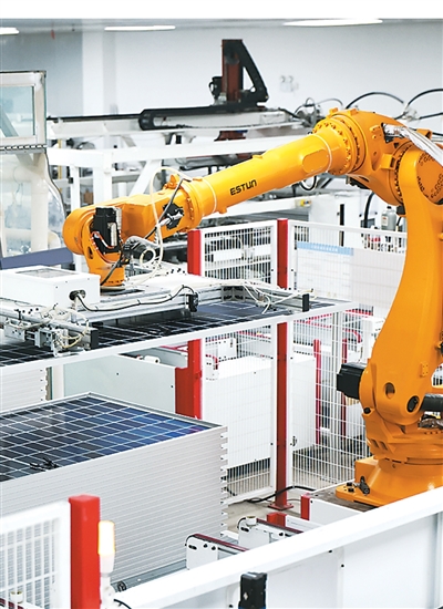 12月15日,位于江苏省淮安市的一家新能源企业生产车间内,机械臂加工光伏组件。