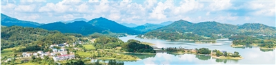 湖北省黄冈市团风县牛车河水库,蓝天白云下的水库碧波荡漾,绘就一幅乡村生态画卷。