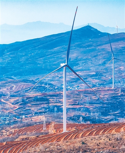 12月15日,河南省洛阳市嵩县九皋镇风电场,一排排风力发电机组迎风转动。