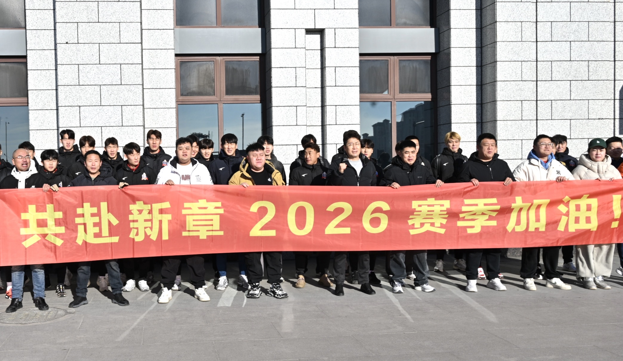 冬日的阳光照亮了延边龙鼎足球俱乐部一线足球队前行的征程,延边球迷代表打出的横幅温暖了球员们的心:“共赴新章,2026赛季加油!”